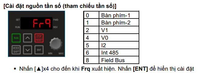 - 3: Chạy bằng truyền thông RS485 (Modbus RTU).