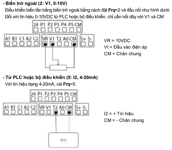 - Chân VR, V1, I2: Dùng cho chiết áp ngoài hoặc tín hiệu Analog 0-10V/4-20mA. VR là nguồn 10V cấp cho chiết áp, V1 là ngõ vào điện áp, I2 là ngõ vào dòng điện.