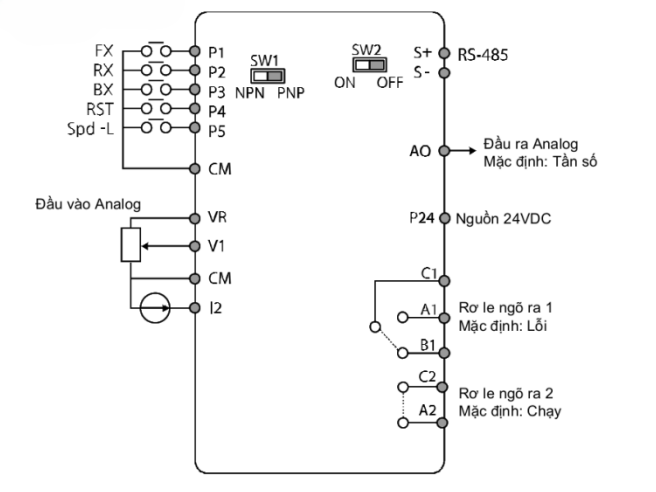 - Chân P1 đến P5: Các chân đầu vào đa chức năng (Multi-function Input). Mặc định P1 là chạy thuận (FX), P2 là chạy nghịch (RX).
